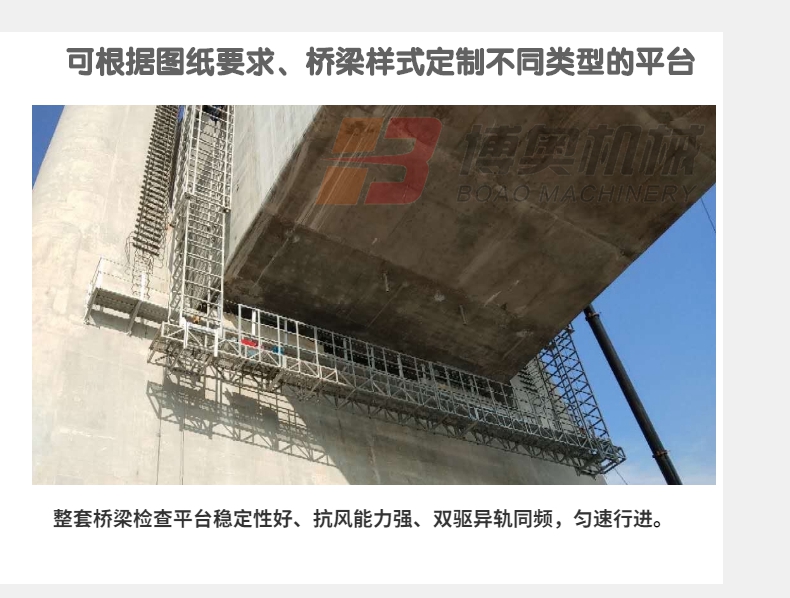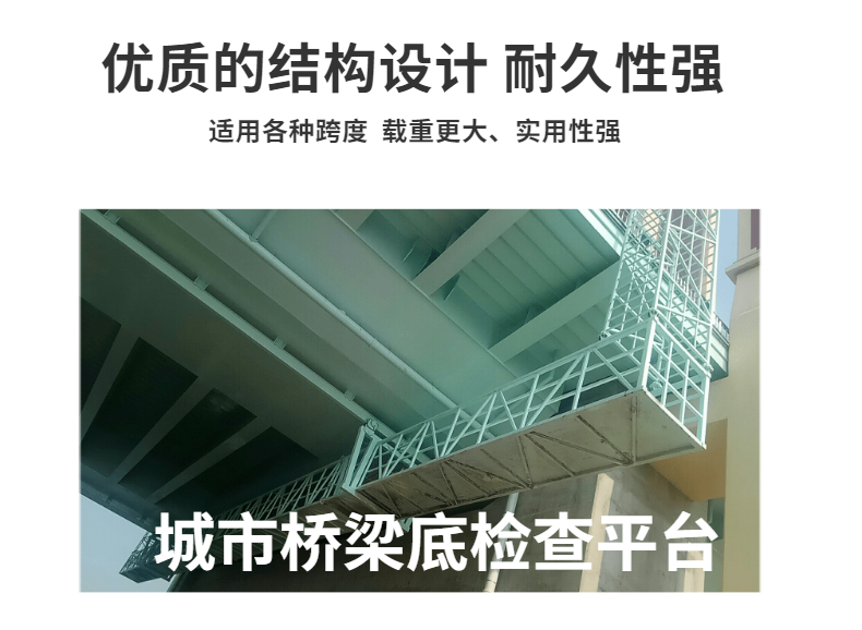 橋(qiao)底檢查車采(cǎi)用行走機構(gòu)通過特制咬(yǎo)合鋼輪倒置(zhì)于熱浸鋅處(chu)理的工字鋼(gāng)軌道上,檢查(cha)車車架與行(háng)走🐅機構⚽相連(lian),在變頻電👄機(ji)的驅動下行(hang)走。檢查車車(che)架主要由方(fāng)形鋼管🐕制成(cheng)的框架式栓(shuān)焊結構,是檢(jiǎn)修橋梁💚時用(yong)于載人和放(fàng)置工具、材料(liao)的平台,整車(che)可在軌道上(shang)沿橋梁縱向(xiang)行走。整個🈲車(che)架爲可拆😘卸(xiè)式結構。