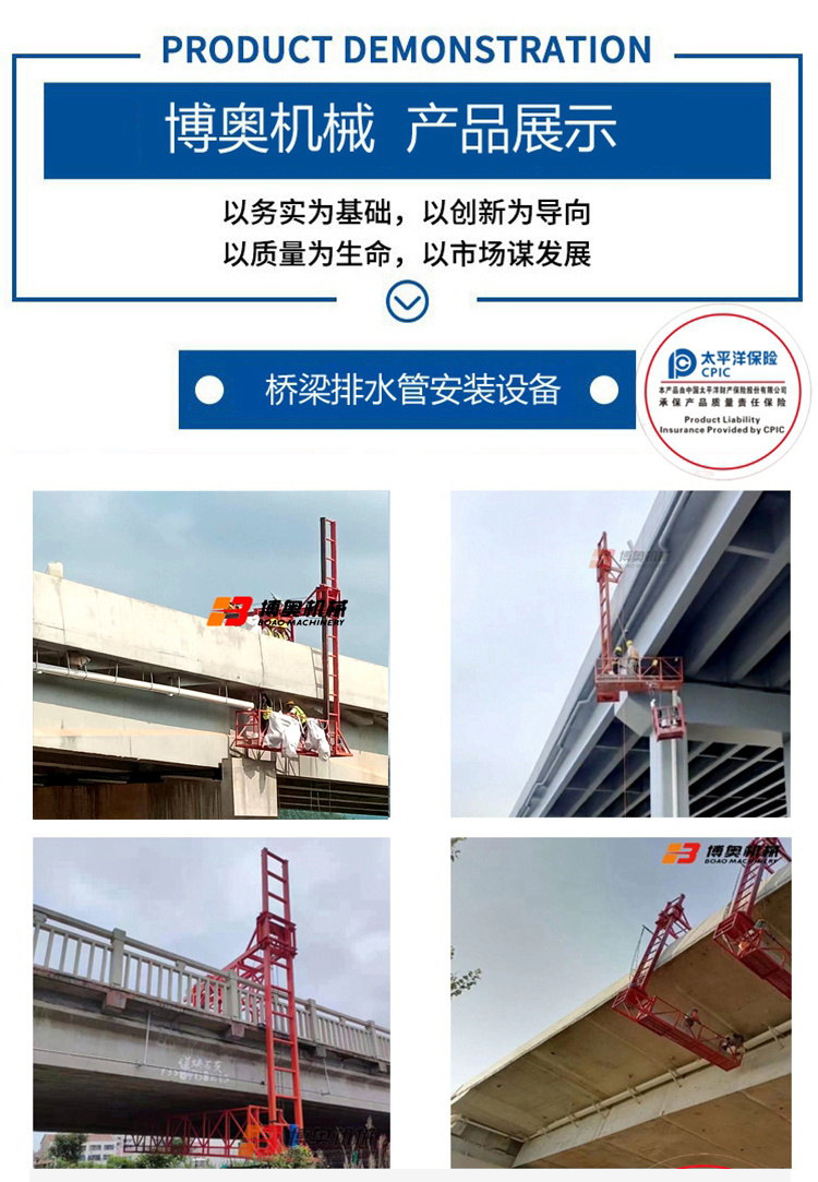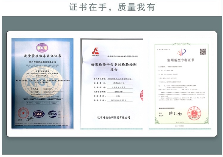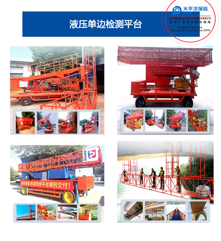 我們公(gōng)司與中(zhong)交、中鐵(tiě)、中建等(deng)大型企(qi)業單位(wèi)建立長(zhǎng)期友好(hao)的合作(zuo)關系;積(jī)累了許(xǔ)許多多(duō)的标杆(gǎn)項目工(gong)程;這也(ye)充分展(zhan)示了我(wǒ)公司具(ju)備很大(da)的實力(li)和技術(shu);一分錢(qian)一分貨(huo),我們秉(bing)承産品(pǐn)品質與(yǔ)服務至(zhì)上的宗(zōng)旨,不斷(duan)提高産(chan)品和服(fú)務質量(liang)。市面上(shang)出現雷(léi)同的産(chan)品,爲了(le)保護廣(guang)大用戶(hù)的合法(fa)權益,請(qǐng)大家認(ren)真辨識(shi),選購正(zhèng)品,安全(quan)高效施(shi)工。強烈(lie)推薦公(gong)司産品(pǐn):橋梁排(pái)水管安(ān)裝設備(bei)、單邊橋(qiao)梁檢測(cè)車、防撞(zhuàng)牆模闆(pan)台車、橋(qiao)梁施工(gōng)吊籃、固(gù)定式橋(qiao)梁檢查(chá)小車。