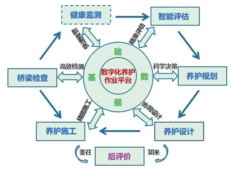 爲适應市(shi)場需要,提高在數(shù)字化養護領域的(de)技術水平,基于統(tong)一的數據标準體(tǐ)系,初步設想的數(shu)字化養護平台主(zhu)要包含基🤩礎數據(jù)、橋涵檢查、健康監(jian)測、智能評估、養🔴護(hù)規劃、養護設計、養(yang)護施工和後評估(gu)共8個基♊礎模塊,各(ge)模塊間數據具有(you)較🈲好的一緻性,确(que)保各模塊間的數(shu)據🐅交互,平台構成(chéng)思路見圖1。截至目(mù)前,在基☂️礎數據、橋(qiao)涵檢查、健康監測(cè)與養護♋設計方面(mian)均開展了部分工(gōng)作,并取🌈得了一定(ding)的應用效果。