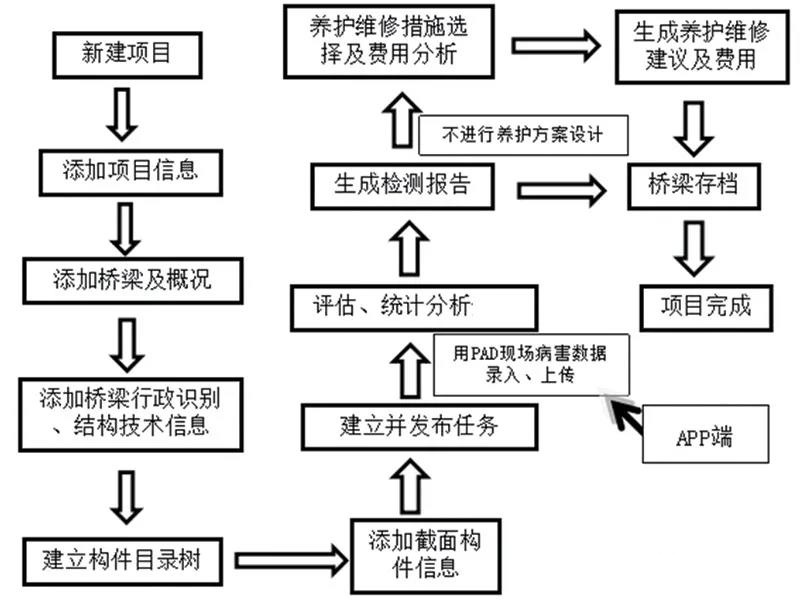 檢測(ce)評估軟件開發的(de)基本思路是設置(zhì)web端和APP端兩個操作(zuò)終端,共享統一的(de)數據庫。web端主要用(yong)于前期行政信息(xī)、結構信息、曆史養(yang)護信息等基礎數(shu)據的錄入,構件目(mù)錄🈲樹建立及後期(qi)報告的編制調整(zhěng)等。APP端主要用于現(xian)場檢測信息錄入(rù),可用于橋涵的日(rì)常檢查、經常性檢(jiǎn)查、定期檢查與特(tè)殊檢查,定期檢♊查(chá)時軟件的操作流(liú)程如圖2所示。
